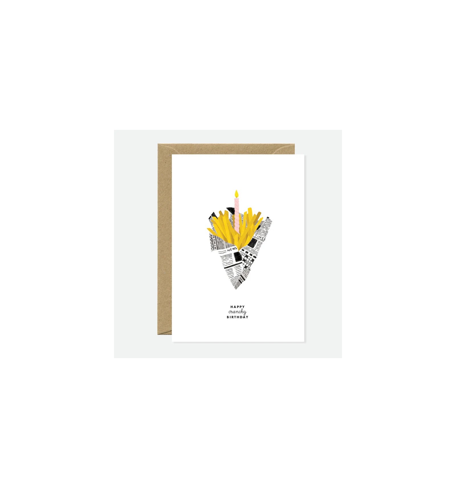 Un brin d’humour et une pointe de gourmandise : le design de cette carte revisite l’anniversaire avec légèreté. Un cornet de frites dorées, une bougie rose et une belle dose de fantaisie signée All The Ways to Say.