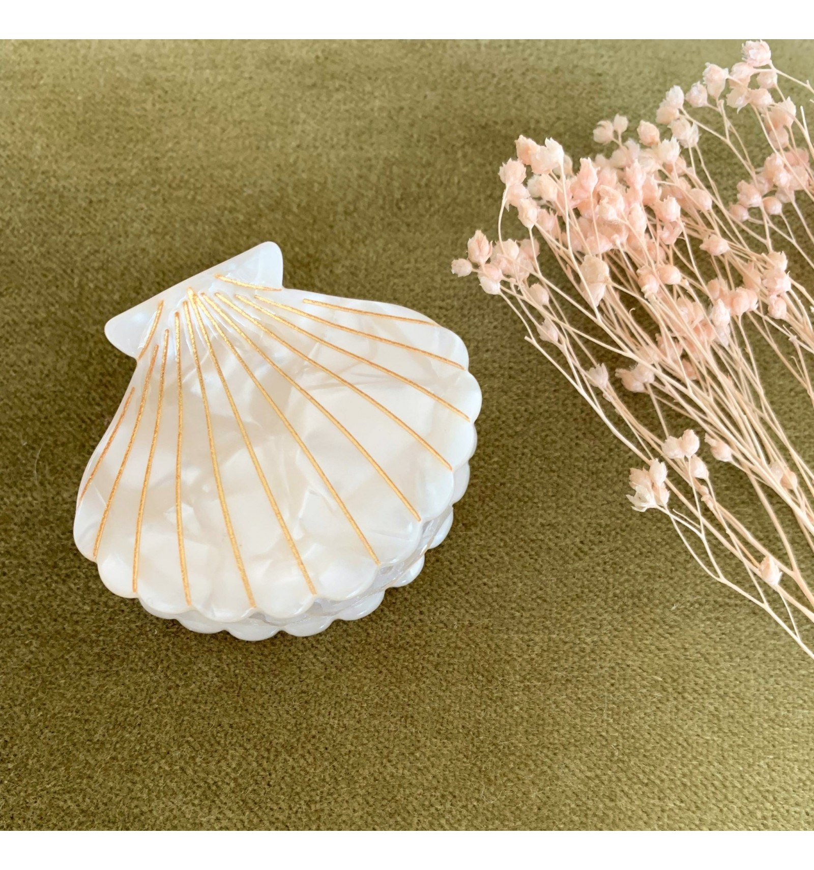 Jolie barrette en forme de coquillage de couleur beige à rayures dorées.