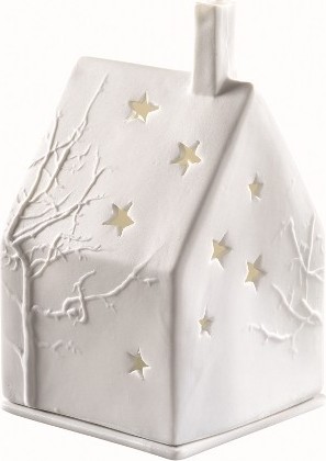 Photophore en forme de maison, en porcelaine non-émaillée diffusant une douce lumière.