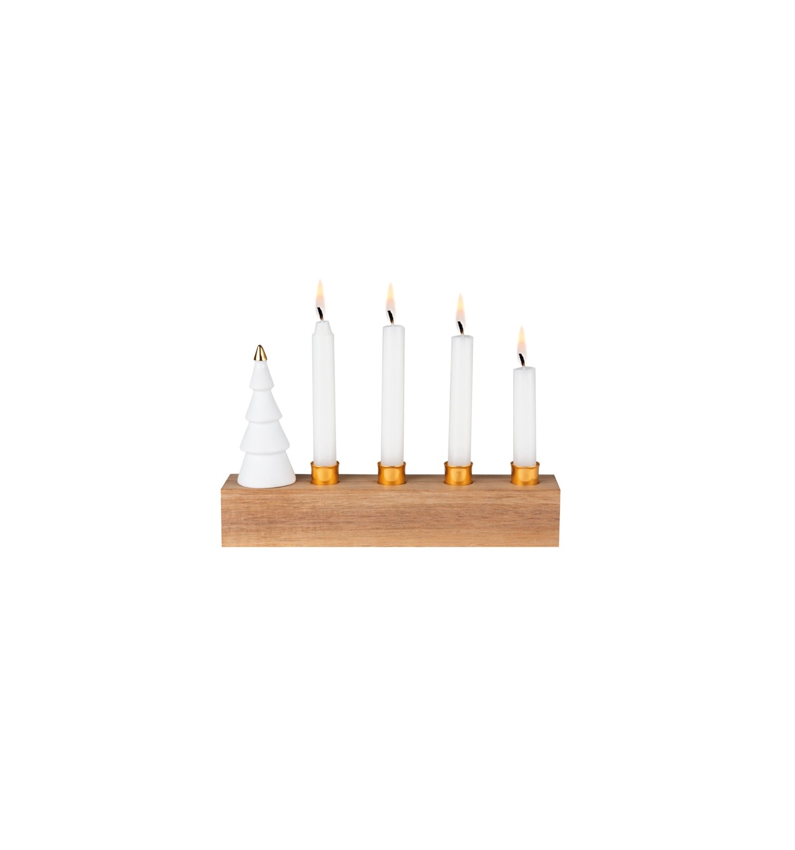 Bougeoir en bois et métal orné d'un sapin en céramique blanc et doré.