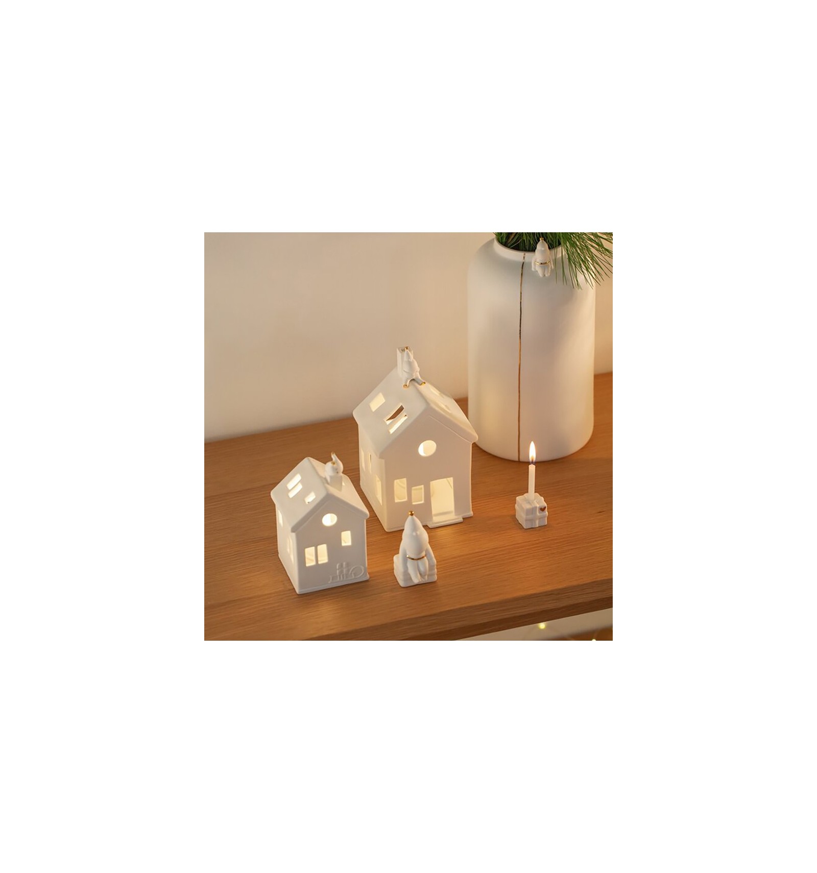 En porcelaine non-émaillée, ce photophore en forme de maison diffuse une douce lumière.