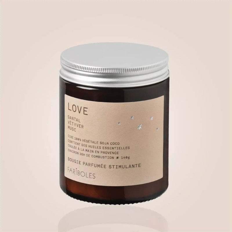 La bougie Love de la marque provençale Fariboles est une senteur chaude et sensuelle où se mêle la chaleur des notes boisées à la puissance végétal du vétiver.