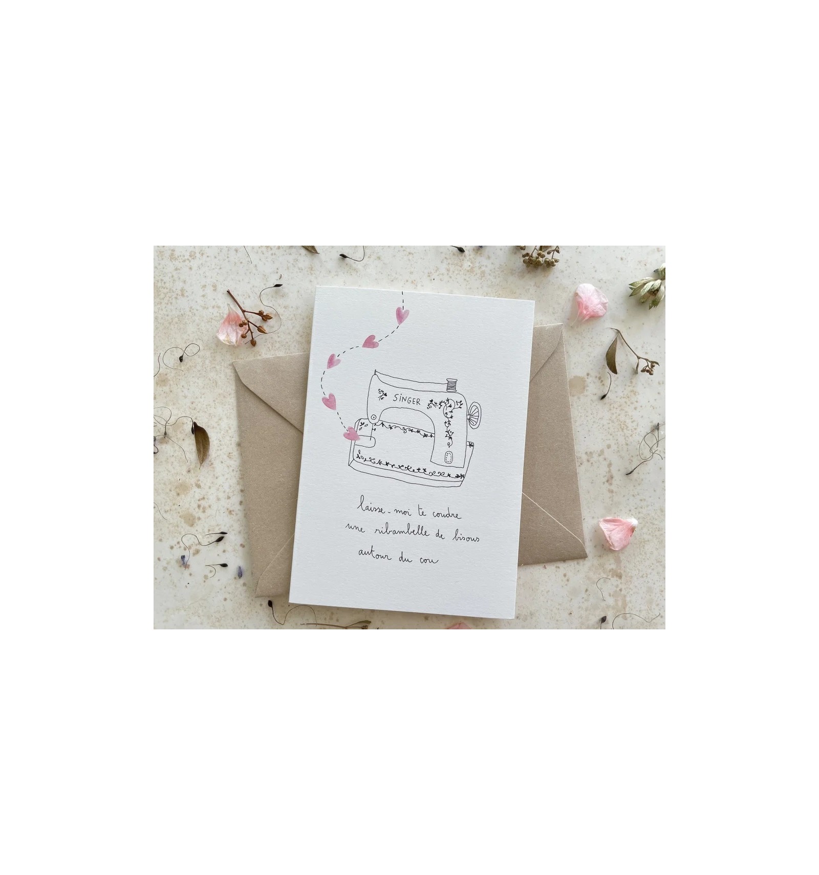 Carte double illustrée avec son enveloppe en papier kraft : "Laisse-moi te coudre une ribambelle de bisous autour du cou".
