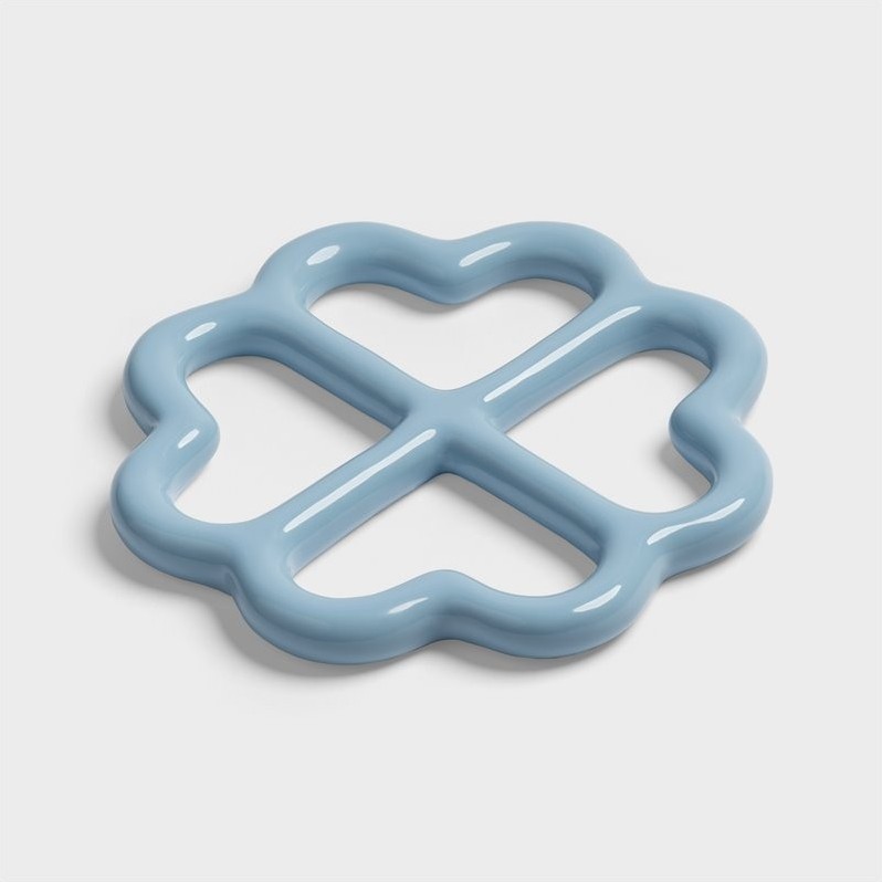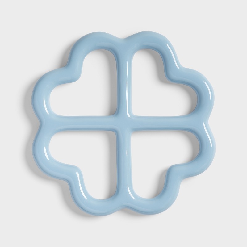 Dessous de plat en céramique dont la forme s'inspire d'un trèfle à 4 feuilles ou de petits coeurs bleus.