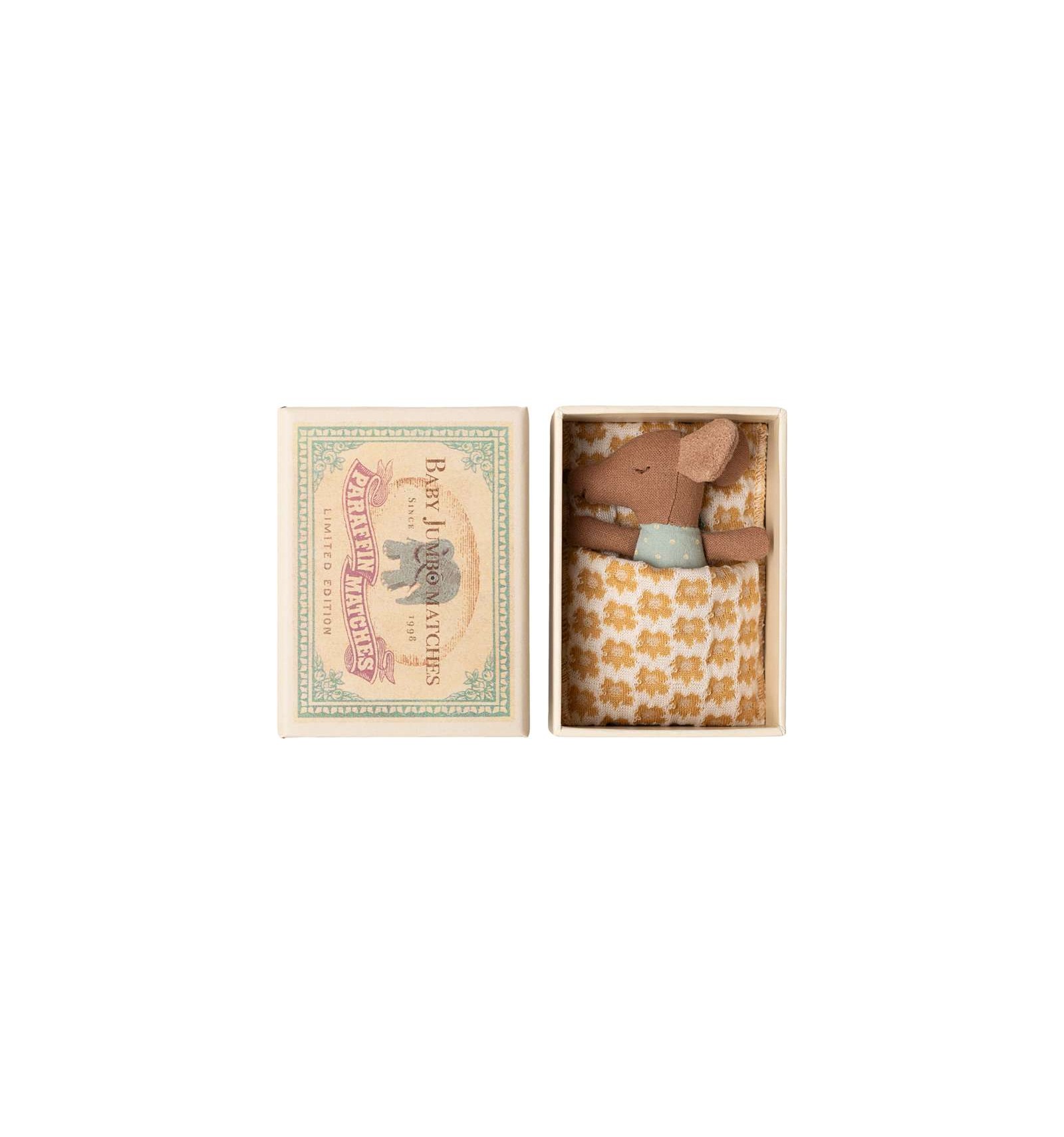 Dans la famille Maileg, voici le bébé. La souris est éveillée d'un coté et de l'autre dort paisiblement. Dans sa jolie boîte en carton, elle est prête pour aller se coucher.