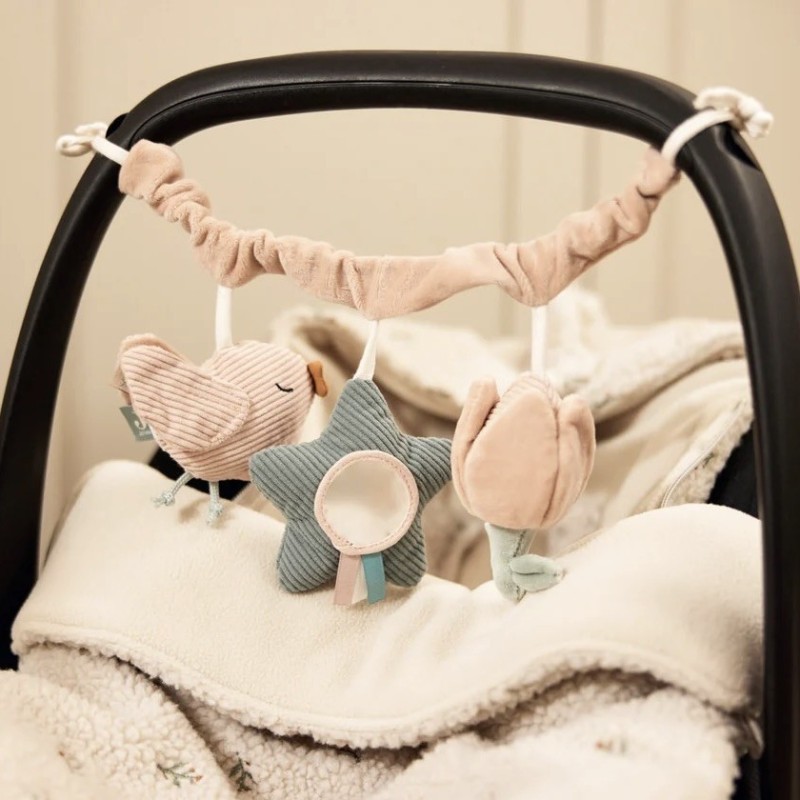 Cette chaîne d’activités Lovely Birds de chez Jollein propose trois jeux amusants : une tulipe, un oiseau et une étoile avec miroir.
