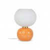 Jolie lampe décorative avec une base en verre brillante orange et un abat jour en verre mate strié blanc.
