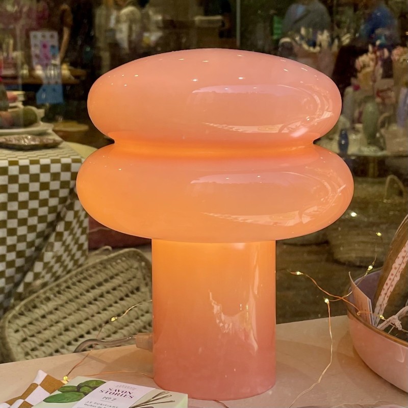 Cette magnifique lampe rose en verre diffuse une douce et chaleureuse lumière.
