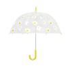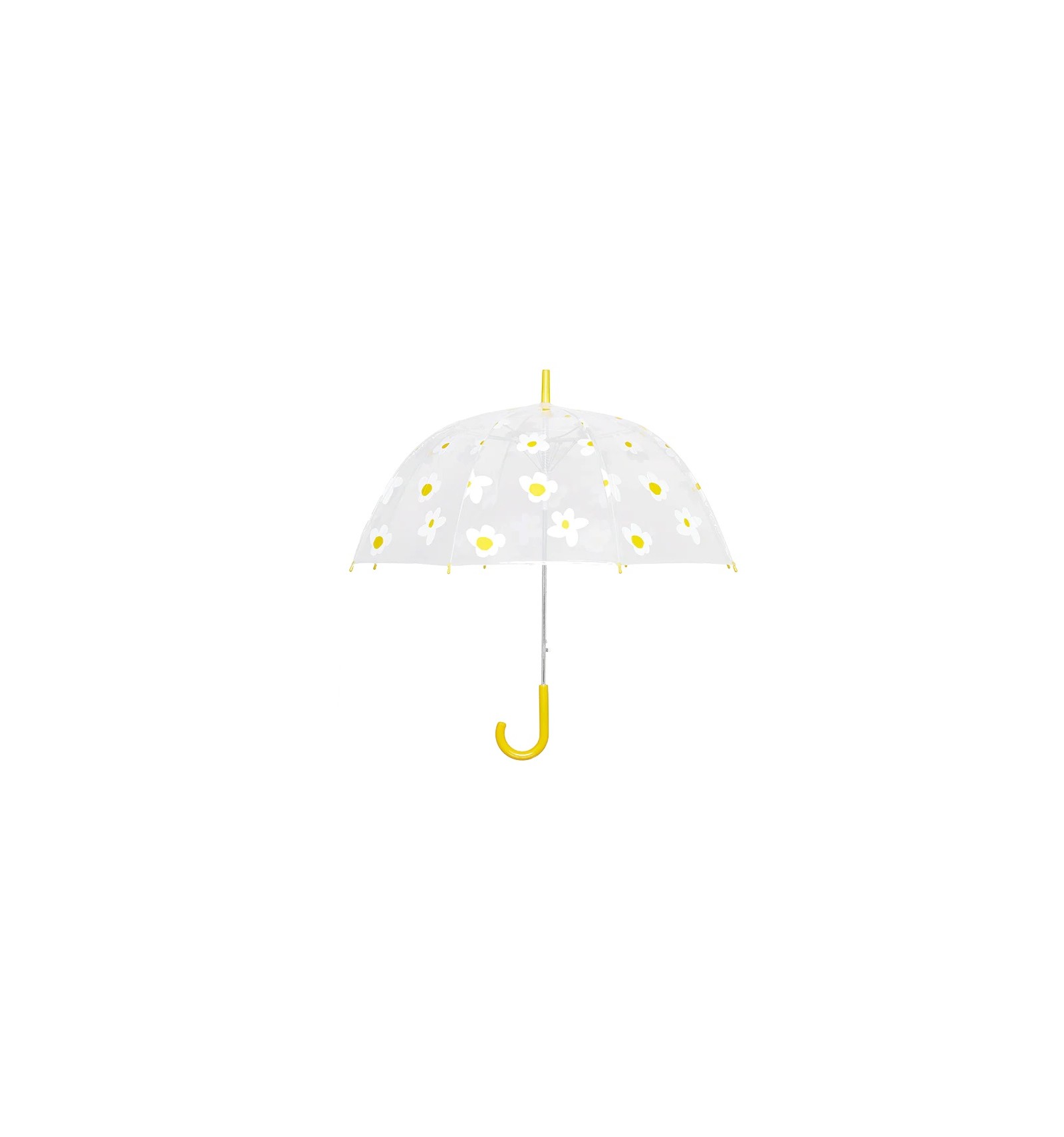 | Caractéristiques | Parapluie forme cloche, transparent, motif fleurs blanches. |