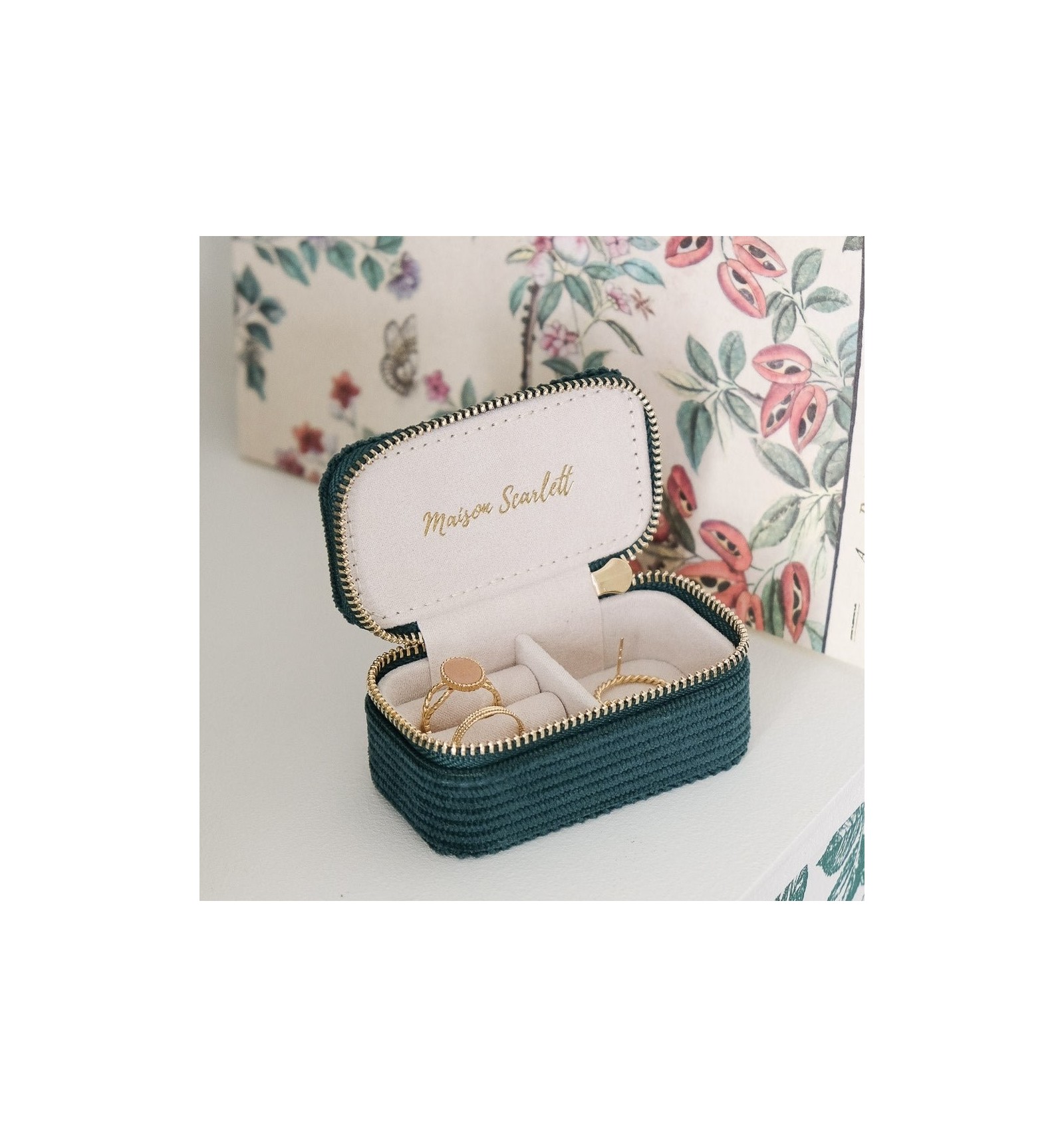 Avec la boîte à bijoux en velours vert Marie de chez Maison Scarlett, emportez vos bijoux partout, sans les abîmer ni les perdre. Fini les colliers emmêlés et les boucles égarées : tout reste bien rangé, prêt à être porté.