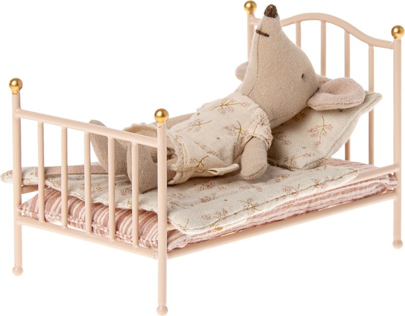 Un superbe lit en métal pour les souris ou lapins Maileg pourvu d'un matelas, d'une couverture et d'un oreiller pour y border les amis de petites tailles de votre enfant.