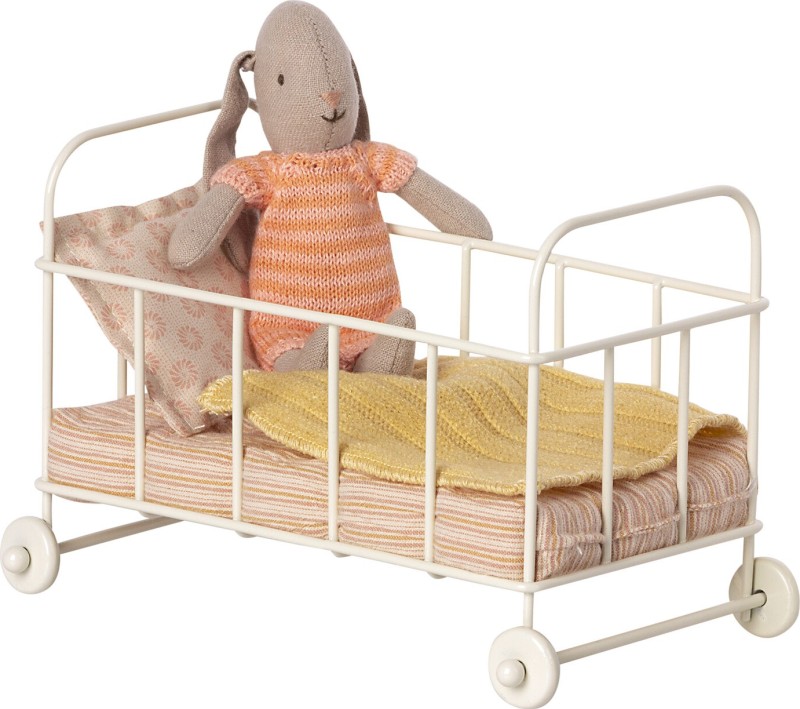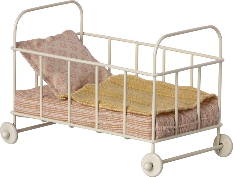 Un superbe lit à roulettes pour bébé Maileg avec matelas, couverture et oreiller pour y border les amis de petites tailles de votre enfant.