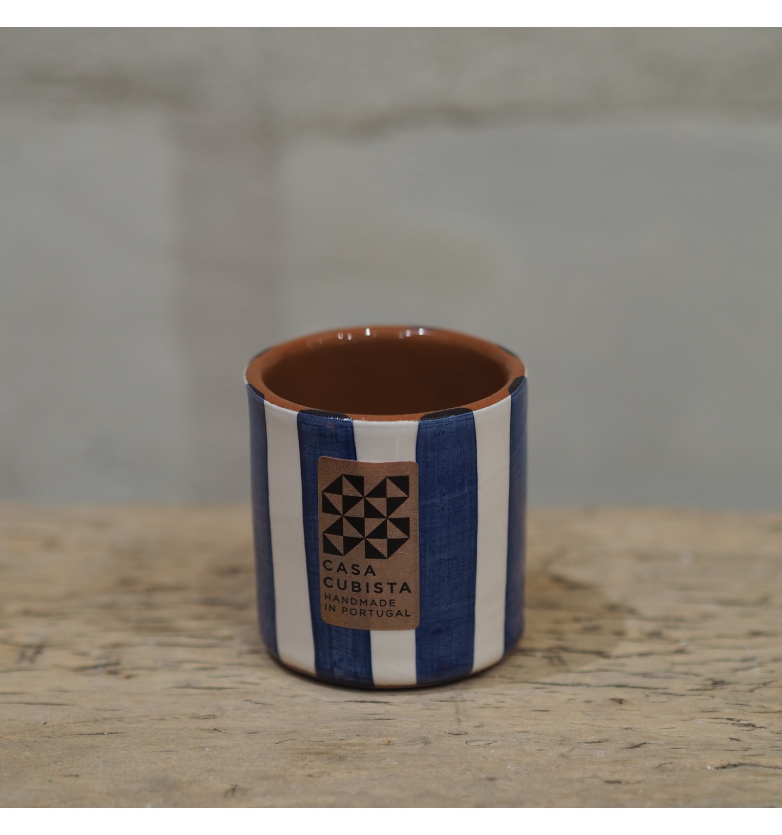 Tasse en céramique émaillée conçue pour accueillir votre café serré avec style. Entièrement fabriqué à la main au Portugal, ce modèle séduit par son motif rayé bleu sur fond crème et son esthétique épurée. Sa forme légèrement irrégulière et son toucher brut en font un objet à la fois authentique et contemporain, parfait pour compléter une collection de vaisselle artisanale ou offrir une touche design à votre pause-café.