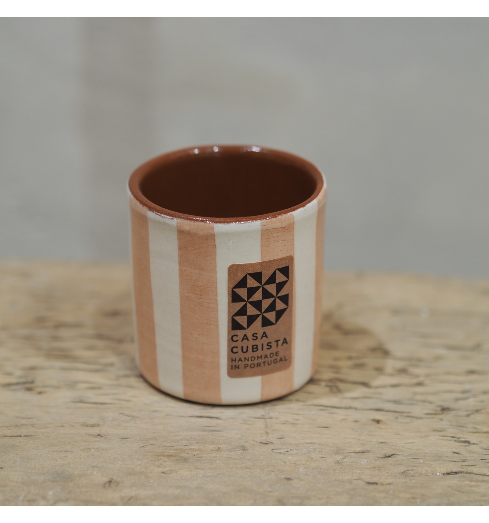 Tasse en céramique émaillée conçue pour accueillir votre café serré avec style. Entièrement fabriqué à la main au Portugal, ce modèle séduit par son motif rayé terracotta sur fond crème et son esthétique épurée. Sa forme légèrement irrégulière et son toucher brut en font un objet à la fois authentique et contemporain, parfait pour compléter une collection de vaisselle artisanale ou offrir une touche design à votre pause-café.
