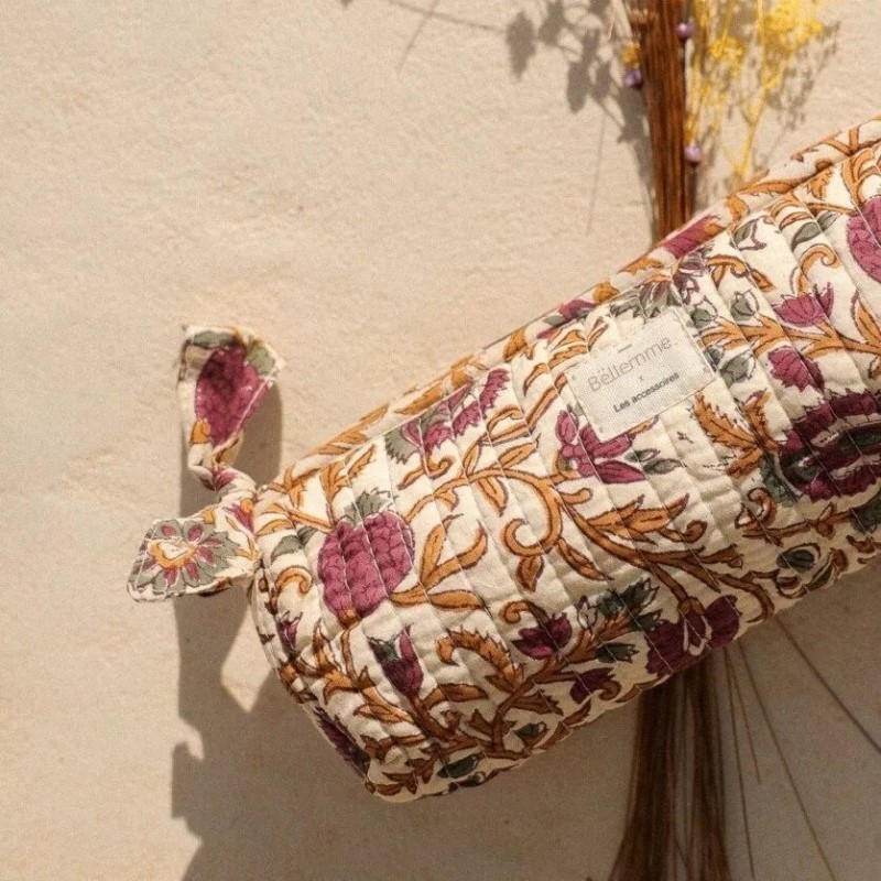 Son magnifique tissu fleuri est imprimé au block print* : technique d’impression au tampon.