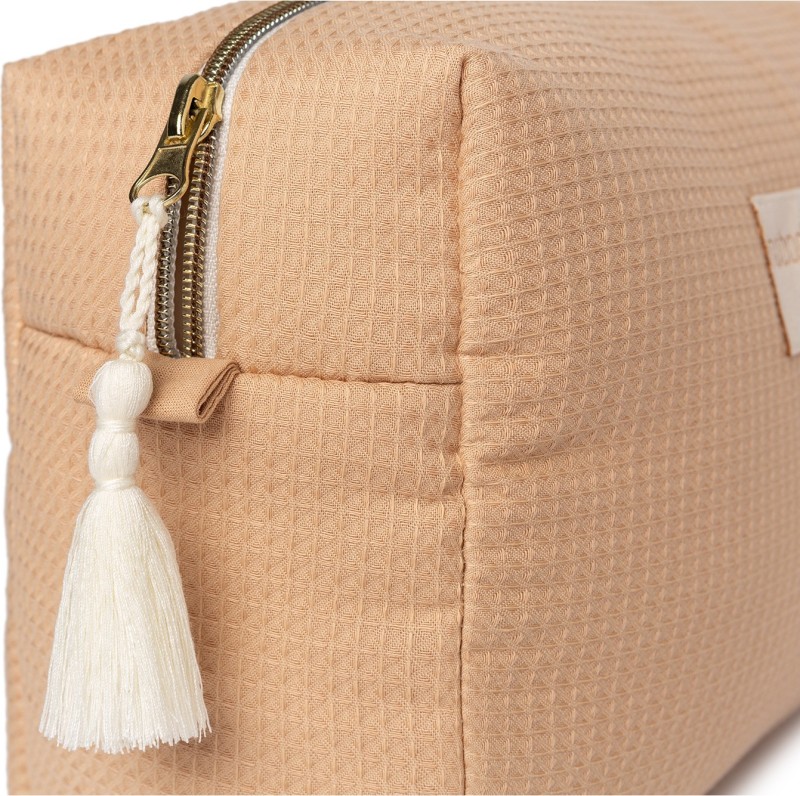 En coton bio, cette trousse de toilette en nid d'abeille est élégante, résistante et imperméable grâce sa doublure intérieure.