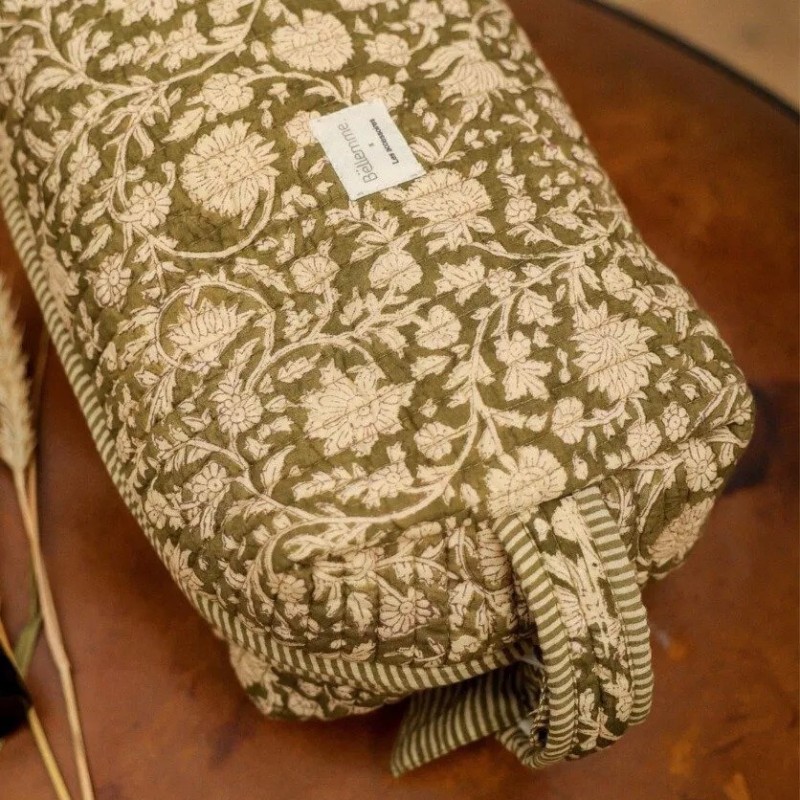 Trousse de toilette entièrement matelassée avec son tissu imprimé au block print : technique d’impression au tampon.