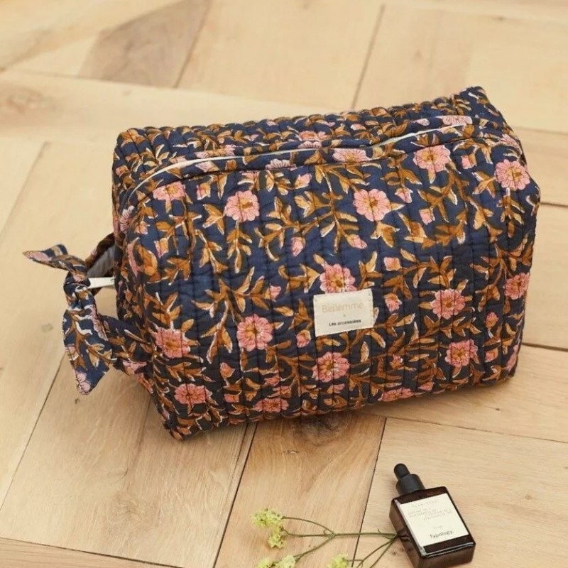 Trousse de toilette entièrement matelassée avec son tissu imprimé au block print : technique d’impression au tampon.
